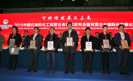 11月26日,由中國石油和化學工業聯合會中小企業工作委員會主辦的2016中國石油和化工民營企業百強發布會暨民營企業國際化發展論壇在山東臨沂召開。會上,中國石油和化學工業聯合會會長李壽生為獲獎的百強企業代表頒獎,中國石油和化學工業聯合會中小企業工作委員會秘書長王靜敏發布2016中國石油和化工民營企業百強報告,我公司位列第七名。
