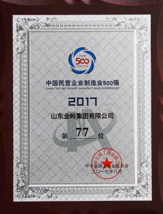 2017年8月24日,全國工商聯(lián)與山東省政府聯(lián)合舉辦的“2017年中國民營經(jīng)濟(jì)500強(qiáng)發(fā)布會(huì)暨民營經(jīng)濟(jì)發(fā)展峰會(huì)”在濟(jì)南舉行,會(huì)議發(fā)布了2017中國民營企業(yè)500強(qiáng)榜單,我公司再次入圍,位列中國民營企業(yè)500強(qiáng)第140位,中國民營企業(yè)制造業(yè)500強(qiáng)第77位。