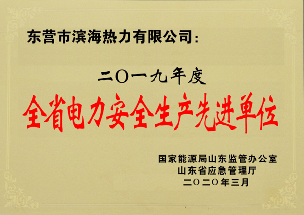 2020年3月2日,國家能源局山東監管辦公室、山東省應急管理廳下發文件,授予東營市濱海熱力有限公司“2019年度全省電力安全生產先進單位”榮譽稱號,以表彰公司在全省電力安全生產工作中做出的突出成績。2019年,濱海熱力公司深入開展電力安全生產專項整治行動、電力行業“安全生產月”活動,圓滿完成新中國成立 70周年系列慶?;顒与娏Π踩U先蝿?,為保持全省電力安全生產穩定運行做出了突出貢獻。