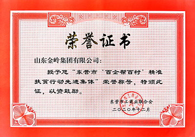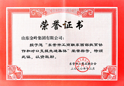 2021年4月,東營市工商業聯合會授予山東金嶺集團有限公司“東營市工商聯抗擊新冠肺炎疫情先進集體”、“東營市工商聯東西部扶貧協作和對口支援先進集體”、“東營市百企幫百村精準扶貧行動先進集體”榮譽稱號,以表彰公司發展不忘回饋社會、踐行企業社會責任的可貴精神。公司在多年來的發展歷程中,始終不忘創業初心,積極參與愛老敬老、捐資助學、扶貧濟困、慈善賑災、幫扶農村建設等活動,為各項公益事業發展做出了突出貢獻。