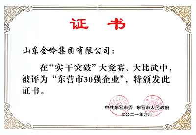 2021年6月27日,在東營市市委、市政府舉辦的“實干突破”大競賽、大比武活動中,山東金嶺集團有限公司被評為“東營市30強企業”。以表彰公司踐行新的發展理念,不斷提高創新能力、優化產品結構、深入發展循環經濟、履行社會責任等方面做出的積極貢獻。