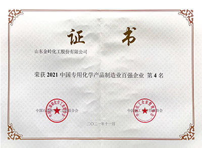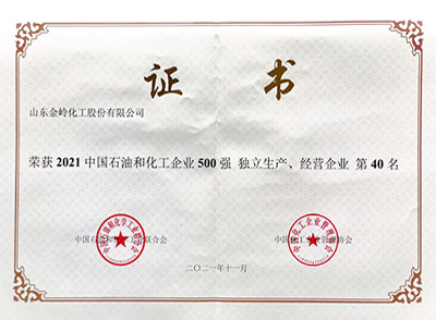 2021年11月29日,在中國石油和化學工業聯合會、中國化工企業管理協會聯合舉辦的“2021中國石油和化工企業500強發布會”上,山東金嶺化工股份有限公司榮獲“2021中國石油和化工企業500強獨立生產、經營企業”第40名、“2021中國專用化學產品制造業百強企業”第4名。