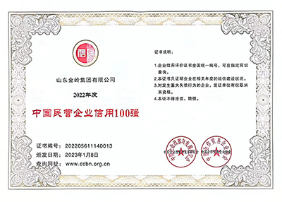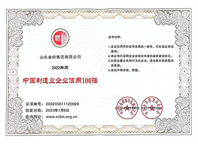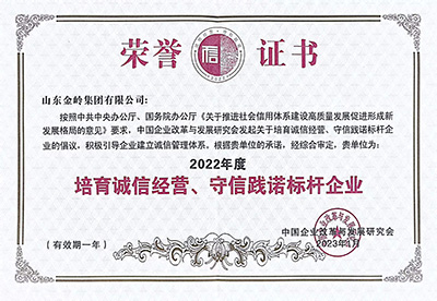 2023年1月8日,在中國企業改革與發展研究會、中國合作貿易企業協會主辦的“2023中國企業信用發展論壇暨第十四界誠信公益盛典”會議上,金嶺集團榮獲2022年度 “中國企業信用500強” 、“中國制造業企業信用100強”、“中國民營企業信用100強”、“培育誠信經營、守信踐諾標桿企業”榮譽稱號。多年來,公司始終高度重視企業誠信體系建設、加強合同履約考核,提升全體員工誠信意識,樹立了良好的企業信用形象。