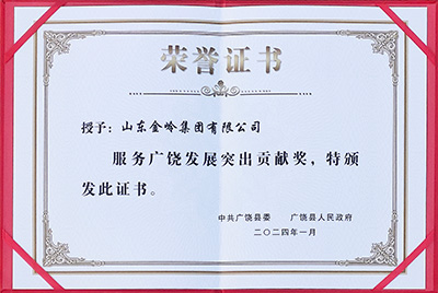 2024年1月19日,在廣饒縣委、縣政府召開的全縣新型工業(yè)化推進(jìn)大會上,山東金嶺集團(tuán)有限公司被授予“服務(wù)廣饒發(fā)展突出貢獻(xiàn)獎”榮譽(yù)稱號,以表彰公司對地方經(jīng)濟(jì)發(fā)展做出的突出貢獻(xiàn)。